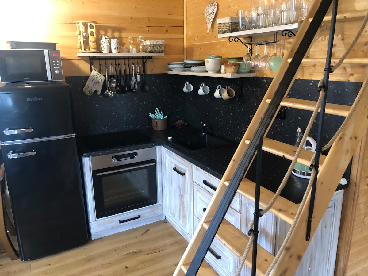 Isang komportableng kubo sa pangingisda sa tabi ng kagubatan at isang lawa kung saan mas mabagal na dumadaloy ang oras. Kinaumagahan, mag-enjoy sa tahimik na almusal sa picnic blanket, magpabiyahe sa bangka, at magpalamig sa araw sa ilalim ng solar shower o magrelaks sa duyan habang pinagmamasdan ang paglubog ng araw. Bago na rin dito ang pribadong wood‑fired sauna—isang perpektong ritwal para sa pagpapainit ng katawan mo sa buong araw. Sa gabi, papainitin ka ng nagbabagang fireplace o fire pit sa labas, habang tahimik na lumilipad sa itaas ang mga paniki. Ang perpektong lugar para sa mga sandali ng katahimikan at pagtakas sa kalikasan.
