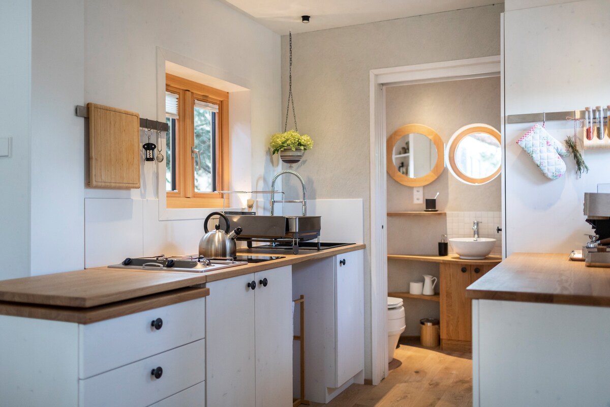 Sa Logis Freyja, nag - aalok kami ng pagkakataon na maranasan ang isang maliit na bahay na may sapat na kakayahan sa sarili sa Switzerland. Sa 33 m2, nag - aalok ang Freyja ng ecological living pati na rin ang maginhawang kaginhawaan para sa holiday o break. Mayroon itong solidong double bed, full kitchen, dining at working corner, banyong may lavabo, shower at separation composting toilet. May espesyal na konsepto sa pag - iilaw si Freyja, na iniangkop sa tuluyan at magagaan na kondisyon na may magagaan na arkitekto.