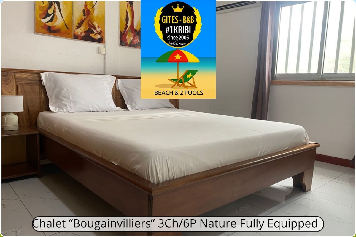 Ang Residence Créolia ay isang kanlungan ng kapayapaan at kaginhawaan na matatagpuan 700m mula sa karagatan, 10mn mula sa sentro ng Kribi, 15mn mula sa Golf de Kribi, 20mn mula sa mga talon ng Lobé. Pinasinayaan ito noong Hulyo 2024. Matatanaw sa 3 kuwartong 104 m2 na ito ang malawak na terrace na 31 m2 kung saan matatanaw ang hardin na may ligtas na swimming pool sa itaas. Ang maluwang na 40m2 na sala ay may sala na may TV at set - top box at malaking silid - kainan. Kumpleto ang kagamitan sa modernong hiwalay na kusina. May 1 banyo at 1 pribadong terrace ang bawat kuwarto.