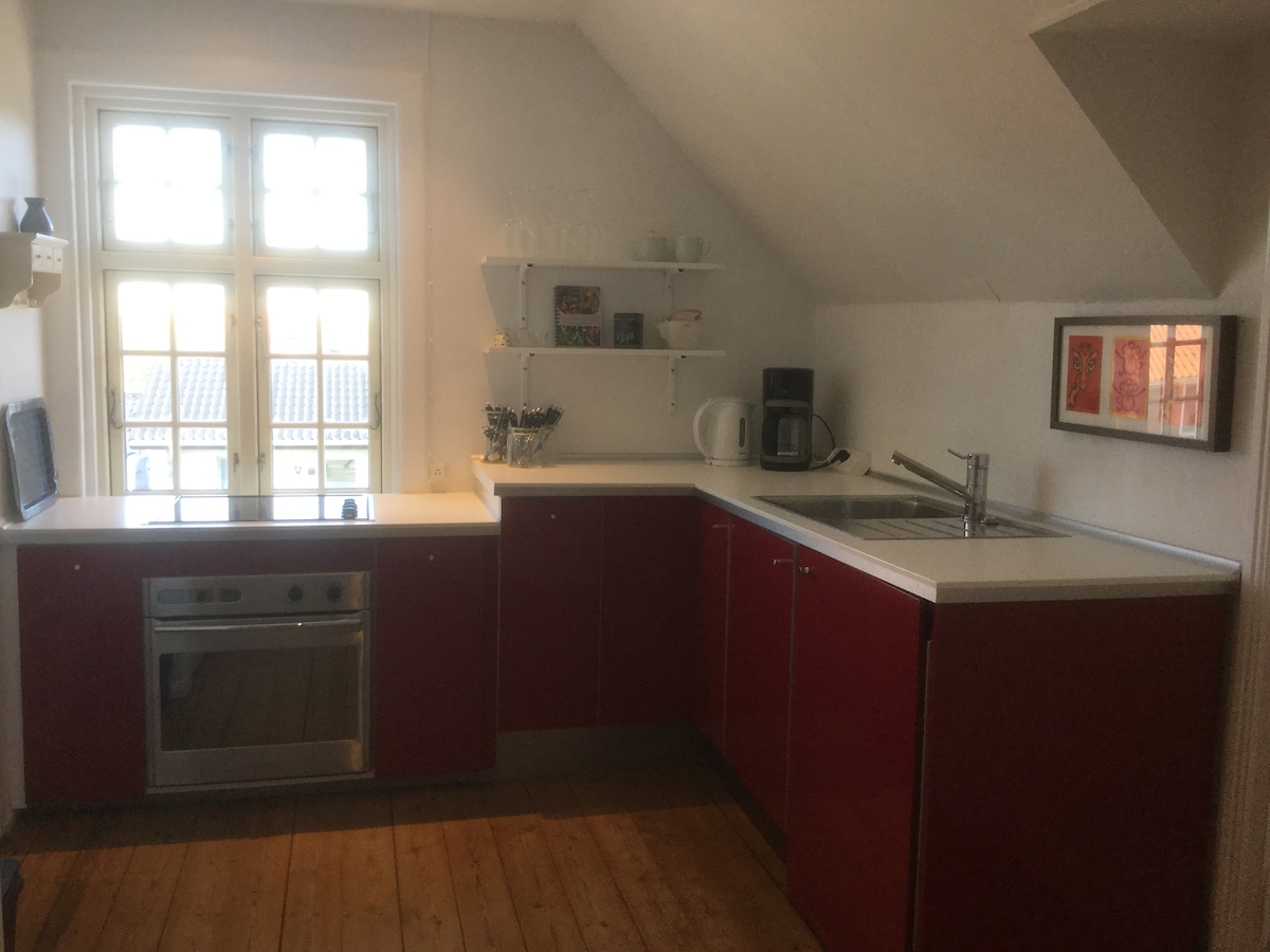 Maginhawang holiday apartment sa unang palapag sa maganda at mas lumang villa. Naglalaman ang apartment ng dalawang kuwarto, sala na may access sa maliit na balkonahe, pati na rin ang sarili nitong kusina at banyo. May kuwarto para sa 4 na tao - kasama ang anumang dagdag na higaan sa sofa bed sa sala. Naglalaman ang kusina ng kalan/oven, refrigerator, coffee maker, cooking pot – at siyempre iba 't ibang kagamitan at pinggan. Puwedeng ayusin ang access sa washer/dryer sa basement ng bahay. Pasukan sa pasilyo ng bahay, ngunit bilang karagdagan ito ay isang hiwalay na apartment.
