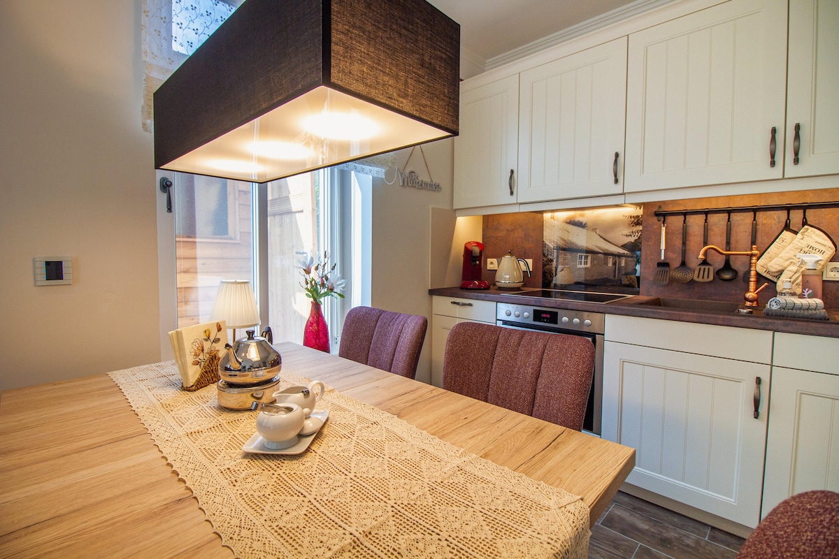 Itinayo muli ang bakasyunang bahay na "Up Besöök"noong 2020 sa kakaibang sentro ng bayan ng Warfendorf Upleward. Nilagyan ang bahay ng smart home system, na ginagawang mas kaaya - aya at interesante ang bakasyon. Nasa ground floor ng bahay ang apartment na "Magnolie" at nag - aalok ito ng napakataas na qualityfurnishing. Nag - aalok ang sala at kainan ng espasyo para magluto at kumain nang magkasama o magrelaks sa komportableng sofa na may magandang libro o magandang pelikula sa OLED SmartTV. Kapag maganda ang panahon, puwede kang mag - enjoy sa maaliwalas na terrace, na direktang mapupuntahan mula sa sala. Bukod pa rito, ang highlight ng apartment ay sa hardin , isang pribadong Swedish sauna. Kaya maaari kang magpainit sa iyong pribadong wellness oasisa pagkatapos ng paglalakad sa taglamig sa malamig na panahon. Nag - aalok ang apartment ng 2 silid - tulugan, ang isa ay may double bed (160x200)at ang isa ay may dalawang single bed (90x200). Nilagyan ang parehong silid - tulugan ng Smart TV, aparador, at dagdag na malalaking duvet (155x220). Sa silid - tulugan na may double bed, ang mga de - kuryenteng adjustable na slatted frameser ay nag - aalok ng ninanais na antas ng kaginhawaan. Ang banyo sa Wildrose apartment ay may walk - in shower, hairdryer at heated towel rail. May washer - dryer din sa apartment. Available ang paradahan para sa iyo nang libre nang direkta sa bahay, at ang mga bisikleta ay maaari ring ligtas na iparada at sisingilin sa isang hiwalay na shed ng bisikleta. Matatagpuan ang "Up Besöök" sa nayon ng Krummhorn sa Upleward, mula rito ay 2 km lang ang layo nito papunta sa tuyong beach, may swimming areabehind ang dike at magandang palaruan para sa mga bata. Para sa higit pang impormasyon tungkol sa Upleward at sa Krummhörn, mag - clickde/de/1861791/pataas "> dito.