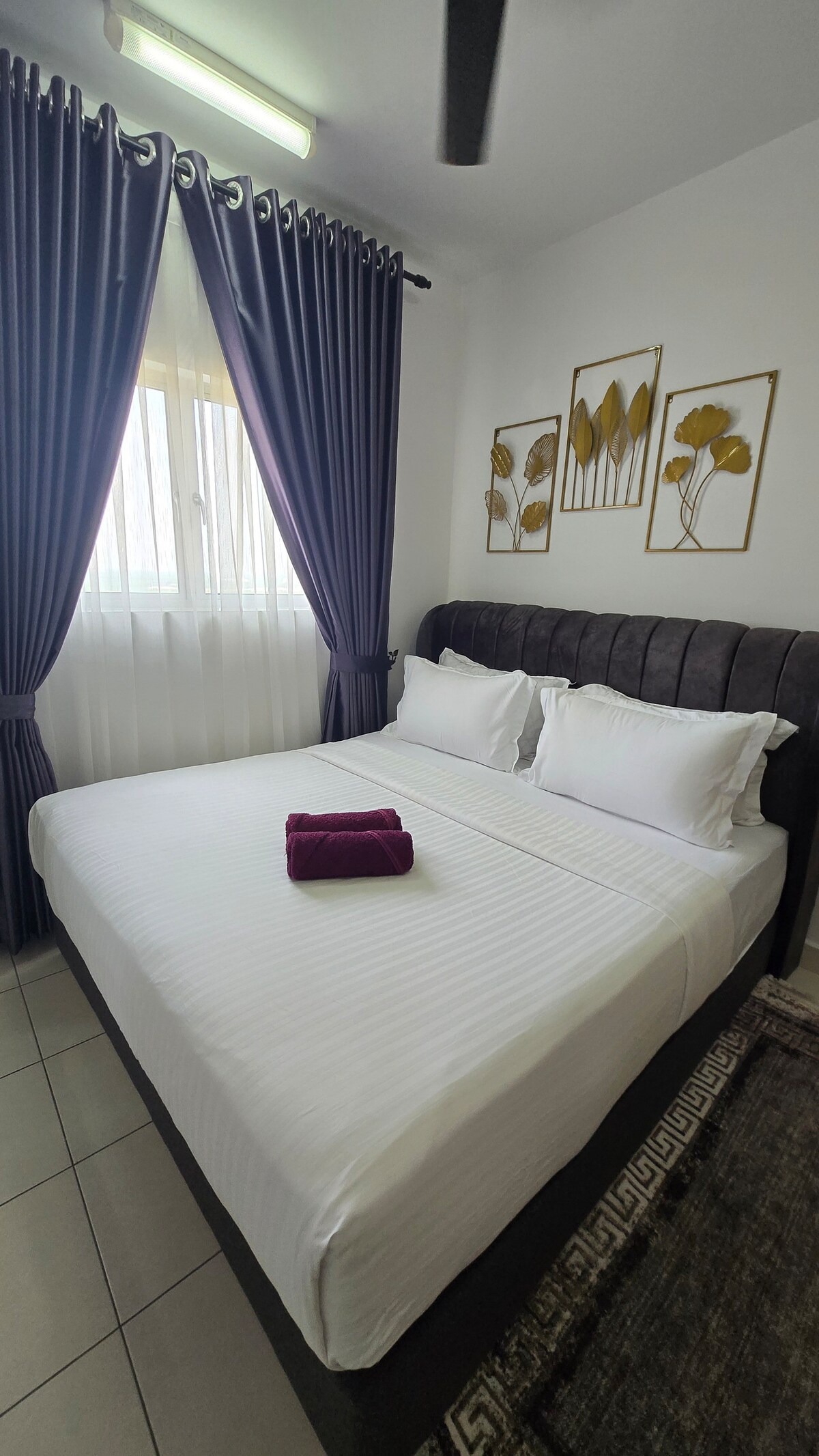 I - explore ang aming komportableng studio, na puwedeng tumanggap ng 2 hanggang 3 tao na may queen bed at sofa bed. 15 minutong biyahe lang ang layo mula sa KLIA T1/T2, napapalibutan ang lugar ng maraming restawran, sanga ng fast food, pamilihan, at labahan. Tangkilikin ang lahat ng amenidad, kabilang ang palaruan ng mga bata, BBQ area, gym, at swimming pool, nang may 24/7 na seguridad. * Hindi available ang iyong bagahe bago ang oras ng pag - check in. Dahil sa disenyo ng gusali, kailangang maglakad ng 10 baitang na hagdan para makakuha ng elevator.
