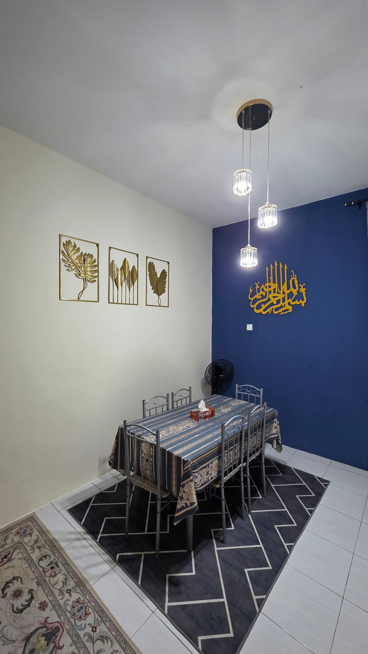 Only for muslim Memuatkan :6-8 orang 🏠3 bilik, 2 bilik air berserta water heater 🛀 - Bilik 1 - 1 Katil King (aircond ❄️) - Bilik 2 - 1 Katil Queen(aircond ❄️) - Bilik 3 - 1 katil Queen(aircond ❄️) 📺2x TV + Netflix +Wifi (1x ruang tamu & 1x master bedroom) 🧊Peti Sejuk 🥘Dapur Gas , Microwave, Toaster 💧Cuckoo Water Dispenser 🚙🚗Parking berbumbung (2 buah kereta) 🧖♂️Tuala mandi 🛋️Ruang tamu, meja makan 🧼Mesin Basuh 👔Iron + Iron board 🕋 Sejadah disediakan * sabun mandi 📶Free Wifi
