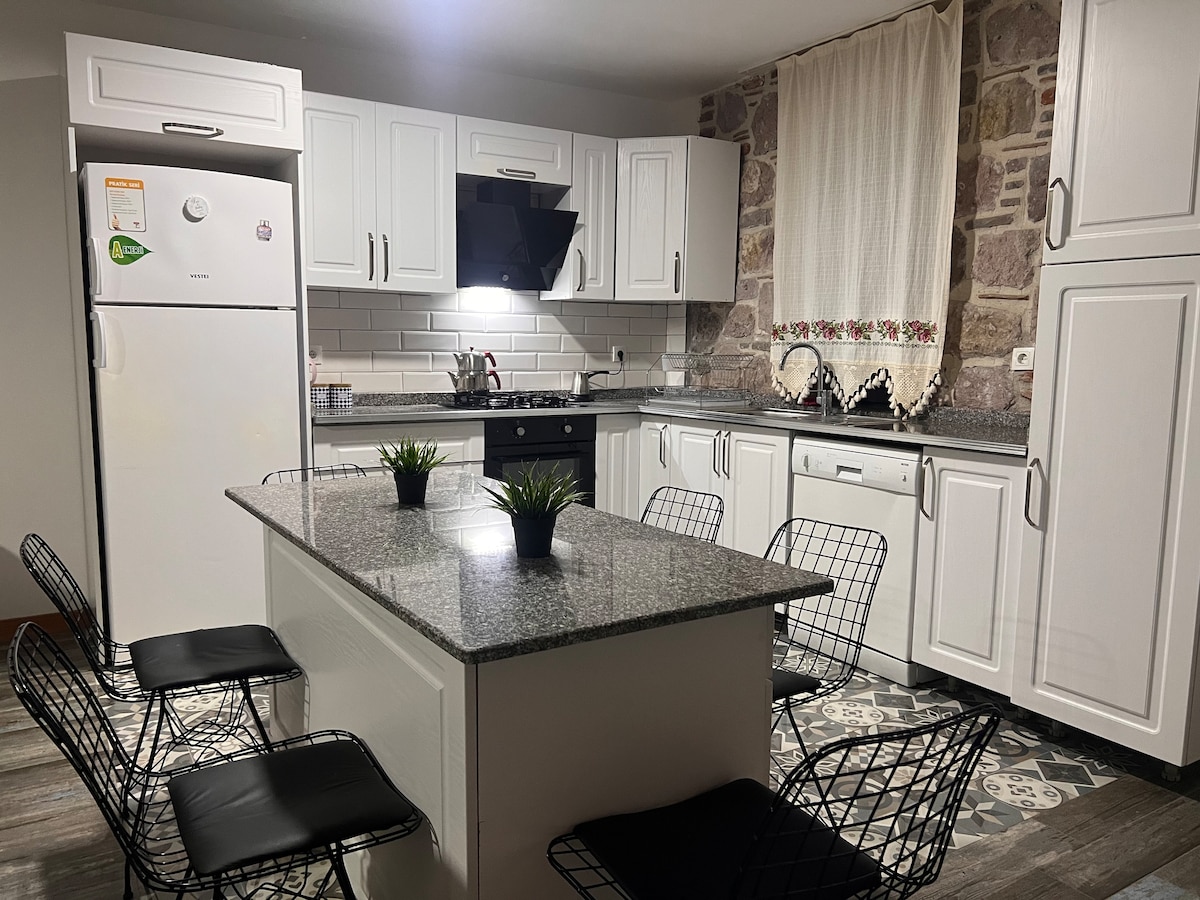 Ang Nur Hanım house ay isang estruktura na itinayo ng mga Griyego noong 1890 at naibalik ito alinsunod sa orihinal noong 2025... Nasa tahimik at tahimik na kalye ang aming bahay na 100 metro ang layo mula sa lugar ng restawran, may paradahan sa ibaba lang ng aming bahay, malapit sa mga pamilihan, puwedeng gawin ang barbecue sa patyo ng aming bahay, available ang lahat ng pasilidad para sa kusina Available ang air conditioning sa mga kuwarto at sala Ang aming bahay ay may 2 banyo at 3 banyo