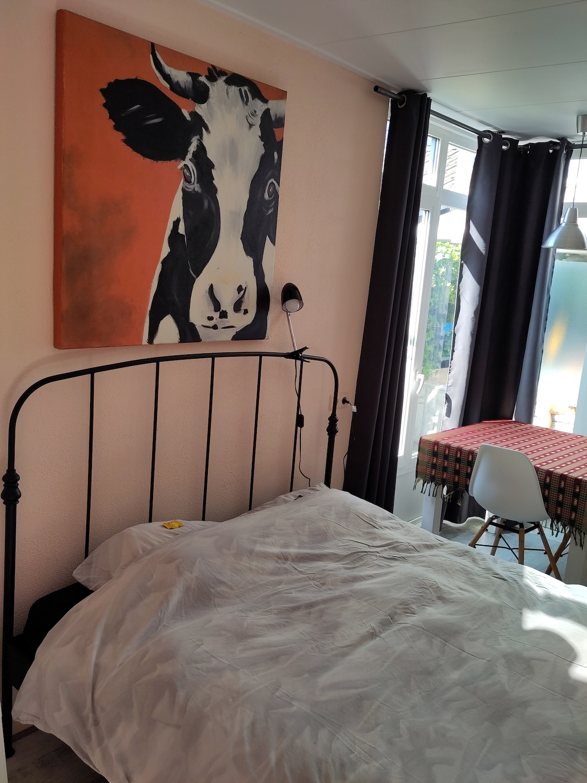 Nice room with your own bathroom with shower and toilet. There's no real kitchen but there is a fridge and combination microwave. You have your own entrance and behind the room is a large public grass field you can use as your garden. After a 3-minute walk, you'll reach a few shops and the bus stop, from there the bus takes you in 22 minutes to the central station. Bicycles are not available anymore. Parking in the neighborhood is free and there's enough space.