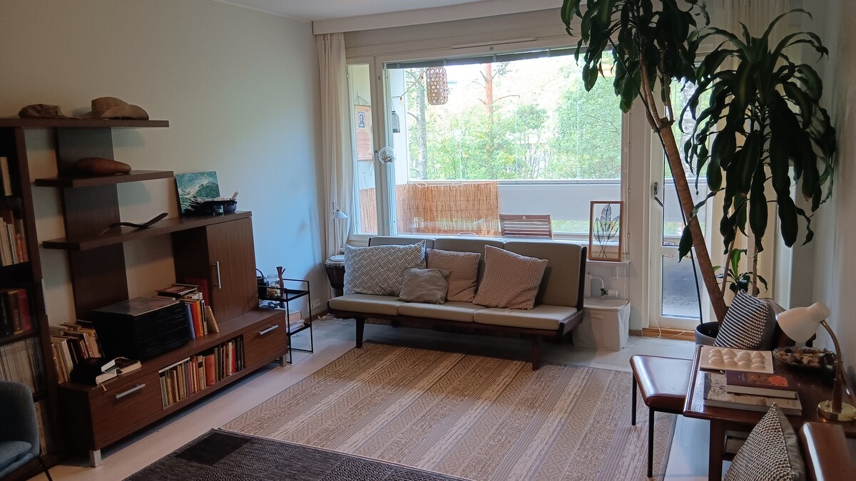 Naka - istilong dekorasyon, magandang glazed balkonahe, at mga pleksibleng iskedyul: maagang pagdating (12:00) /late exit (18:00). Magandang lokasyon malapit sa paliparan sa gitna ng Tikkurila. Sa pamamagitan ng paglalakad papunta sa istasyon ng tren 10 minuto, mula sa kung saan may direktang koneksyon sa paliparan (10 min) o sa sentro ng Helsinki (15 min). Humihinto rin sa Tikkurila ang lahat ng malalayong tren. Malalaking tindahan ng grocery (Prisma, K - Supermarket/ 200m / open 06 -24) at maraming restawran sa malapit. Available ang mainit na lugar para sa garahe nang may karagdagang bayarin.