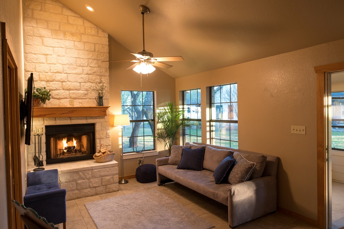 I - book ang susunod mong pamamalagi sa aming Ranch guest house. Matatagpuan sa mapayapa at pribadong 10 acre property sa Hill Country at 30 minutong biyahe lang papunta sa downtown, Lake Austin at Travis. Marami sa mga pinakamagagandang gawaan ng alak, serbeserya, at distilerya sa Texas ang kasing - maginhawa ng 5 minuto ang layo. ADA compliant w/2 bedrooms/1 bath with a tub and separate shower, a large, wood burning fireplace a large deck, screened in veranda, century old Oaks, views of wildlife year round.