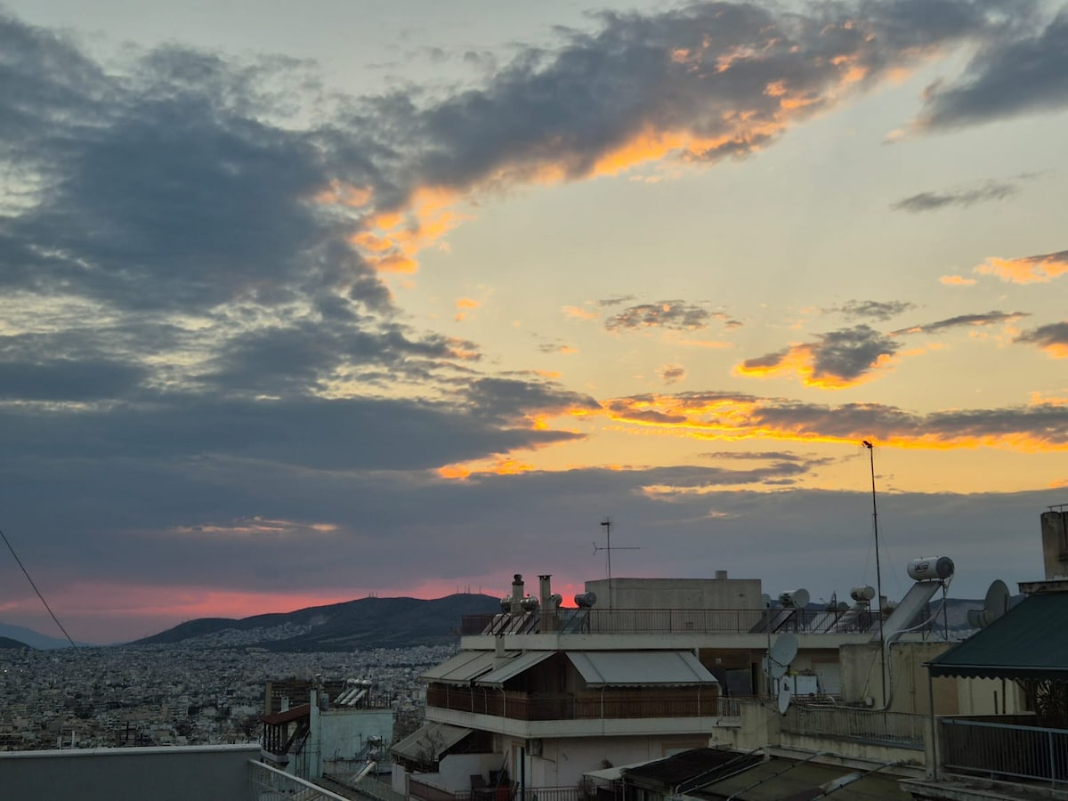 Matatagpuan ang modernong na - renovate na 60m2 5th floor penthouse apartment na 4 na minutong lakad lang ang layo mula sa istasyon ng metro na Panormou sa linya ng paliparan, isang perpektong tahimik na 'basecamp' para sa pagtuklas sa Athens! Maingat na idinisenyo at pinalamutian ko bilang isang arkitekto, ang apartment ay kumpleto sa lahat ng gusto ng isa, dalawang smart TV (sa kuwarto at sala) at isang cute na sulok ng fireplace. Dalawang malaking balkonahe na may mga halaman sa magkabilang panig na may nakamamanghang malawak na tanawin sa lungsod at bundok ng Ymitos. Mag - enjoy!