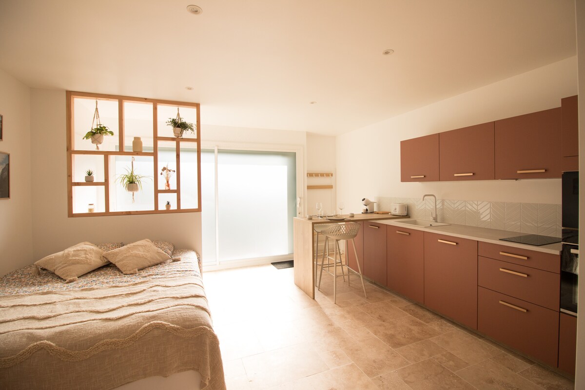 Matatagpuan ang makulay na studio sa unang palapag ng bahay namin na mula pa noong ika‑19 na siglo, at may hiwalay na pasukan. Direktang nakakabit ang studio sa pinaghahatiang hardin na puwede mong gamitin. May mga mesa para kumain sa lilim ng mga puno ng palma. Ang studio ay napaka - tahimik, hindi napapansin. Para ma-access ito, basahin nang mabuti ang gabay sa pagdating;=) Ikaw ang bahala sa paglilinis.. o may opsyon kang piliin ang bayarin sa paglilinis na may karagdagang singil na €20, na hihilingin sa pag-book.
