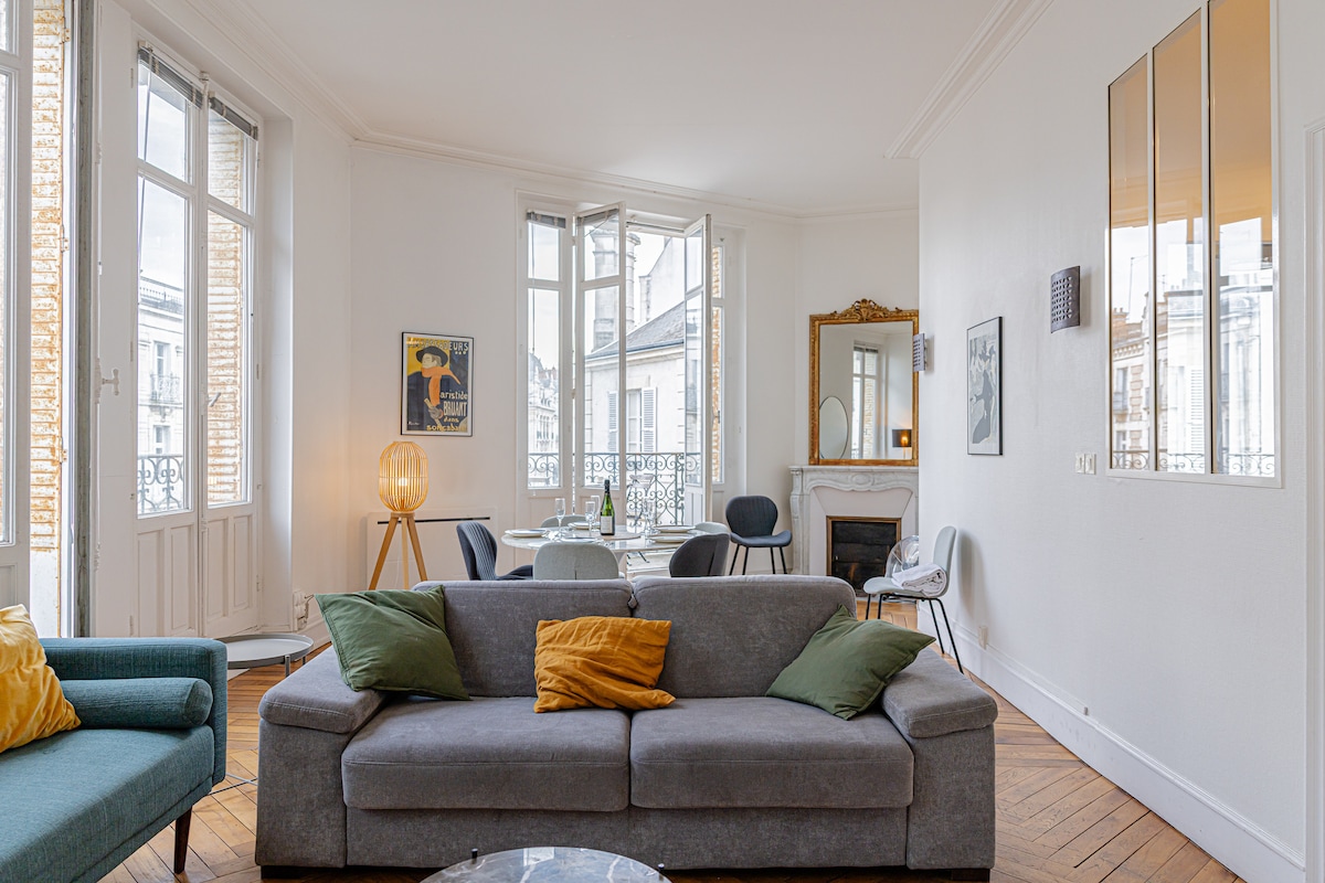 Hyper center ng Orléans, kaakit - akit na apartment 1st floor. Maluwang na T2/T3, 60 m2, na pinagsasama ang makalumang kagandahan at kaginhawaan sa sentro ng lungsod. Malapit sa mga tindahan, transportasyon, Katedral. Kumpletong kusina, magandang sala, malalaking bintana, magandang parke, marmol na fireplace, isang silid - tulugan na may double bed, isang silid - tulugan na bahagi na katabi ng sala na may BZ sofa bed na maaaring tumanggap ng 2 higaan, isang mainit na kurtina na naghihiwalay sa 2 kuwarto para sa privacy. Hiwalay ang banyo at wc.