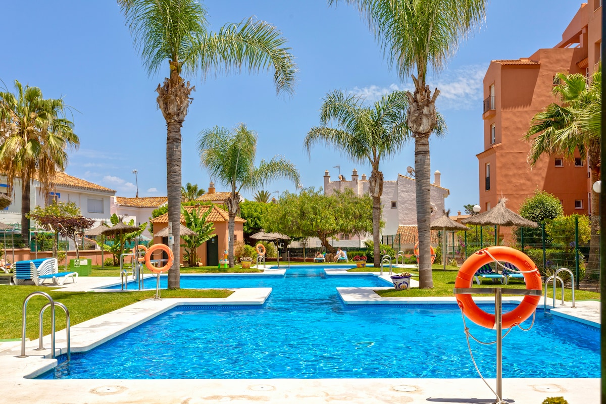 Maluwag na apartment na 600 metro ang layo mula sa beach kung saan matatanaw ang dagat. Matatagpuan ang apartment sa isang residential area sa ikalawang palapag (elevator), kusinang kumpleto sa kagamitan, central air conditioning (heating at air conditioning), 2 silid - tulugan na may mga banyo, terrace. 10 minutong lakad mula sa beach. 5 minutong biyahe papunta sa Port of Duquesa kung saan makakakita ka ng iba 't ibang restaurant, bar, at aktibidad. Naglalaman ang complex ng pool pati na rin ng dalawang shared paddle board at tennis court.
