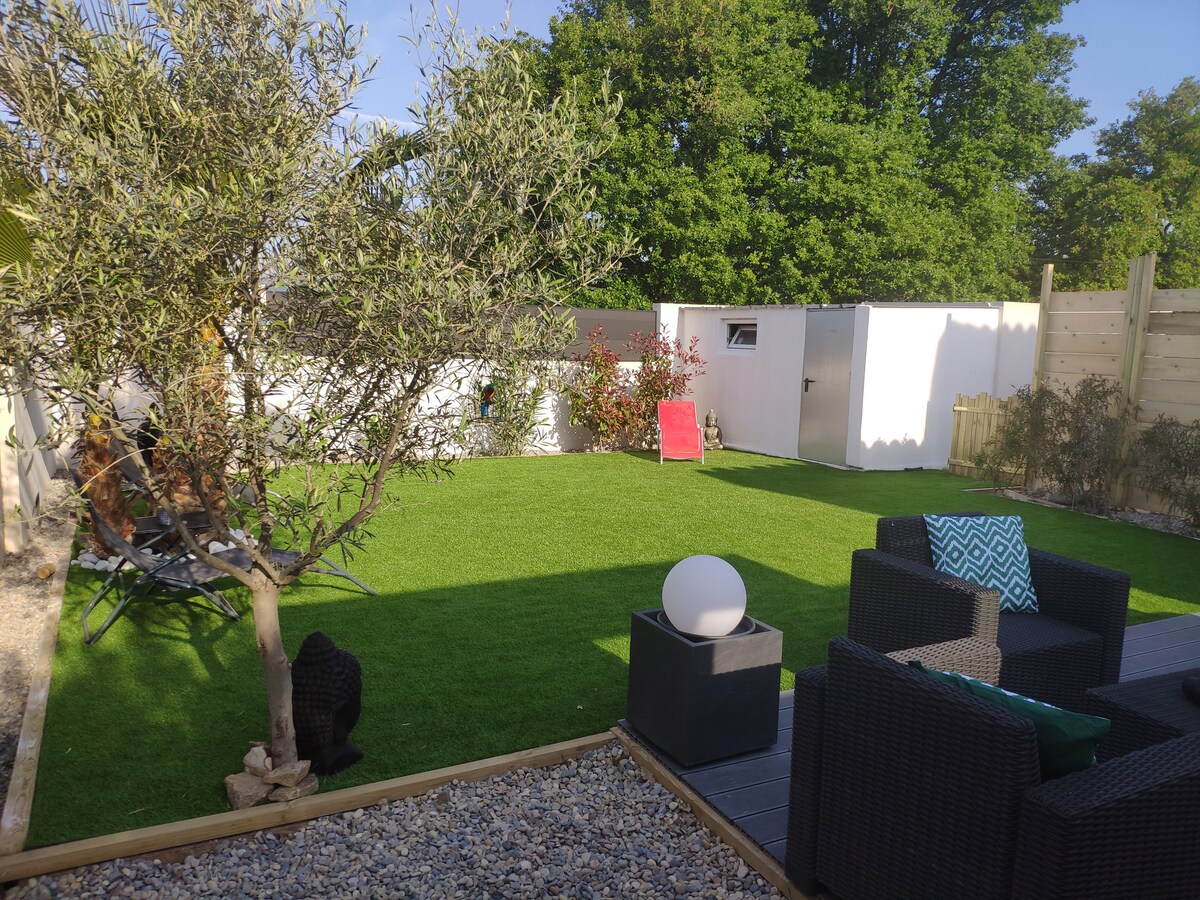 Ang panaklong ay isang maliit na independiyenteng villa na 45 m2 nang hindi tinatanaw ito, tahimik na pinalamutian, may magandang dekorasyon. Masisiyahan ka sa tag - init at taglamig sa hot tub na pinainit hanggang 38°. Ang mga hot tub at masahe ay magbibigay sa iyo ng walang kapantay na kapakanan. Ang hot tub ay protektado sa ilalim ng bioclimatic pergola na may mga kurtina na hindi tinatagusan ng tubig para sa privacy at pinakamainam na kaginhawaan. Para sa isang espesyal na okasyon, mga rosas na petal at kandila kapag hiniling. Huwag mag - atubiling. Inaalok ang almusal sa unang gabi