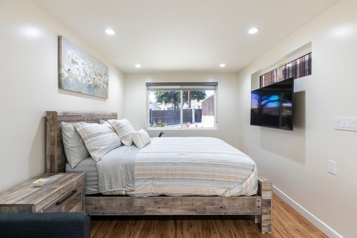 Mid-Century modern studio guest house located in Burbank, CA. Our back unit is a perfect getaway for those traveling through Los Angeles. The private studio is new with all of the amenities needed for a comfortable stay. The prime location provides a safe and quiet neighborhood good for leisure walks or exercise. Minutes to Downtown Burbank, Warner Bros, Disney, Universal Studios. 10 minutes from Burbank Airport. Walking distance to DeBell Golf course and Stough Canyon Nature Center.