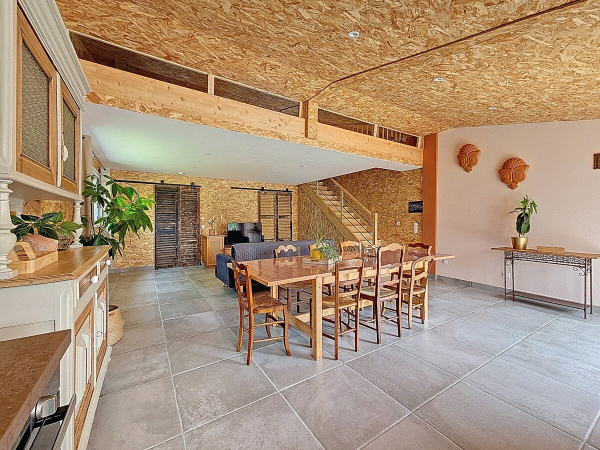 Grande maison de campagne rénovée avec soin et avec goût pour vous permettre de beaux moments de convivialité, jusqu'à 15 personnes (enfants, bébés inclus et 12 adultes (+de 13ans ) maximum). Vous apprécierez son espace de vie de plus de 80m2, lumineux et propice à la détente avec un accès direct à la Piscine Intérieure Chauffée à 28 degrés toute l'année !