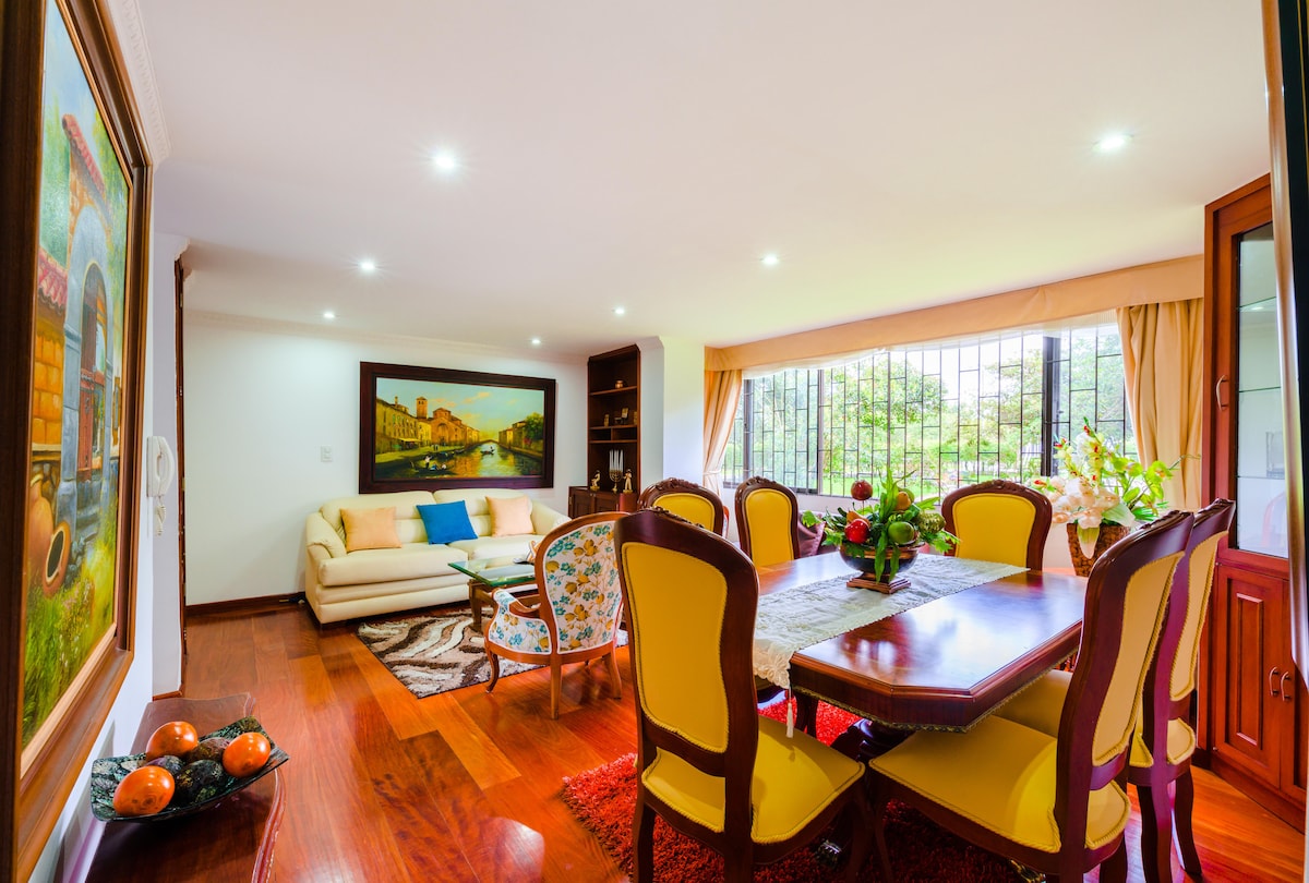Maligayang pagdating sa aming maganda at maluwang na tuluyan, na ganap na na - renovate at maganda ang dekorasyon. Moderno at kumpletong kagamitan sa kusina (kasama ang dishwasher) na may mesa ng kainan sa kusina at labahan na may washer dryer 2 silid - tulugan , 2 banyo , TV room na may sofa bed, at studio room na may desk. Libreng walang limitasyong High speed wifi 4 na TV (isa sa bawat kuwarto, isa sa kusina) Pangunahing lokasyon: malapit sa paliparan, US Embassy,stadium, Corferias, mga shopping center, Simon Bolivar Park, pampublikong transportasyon.