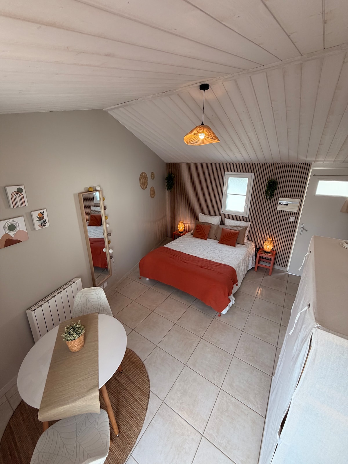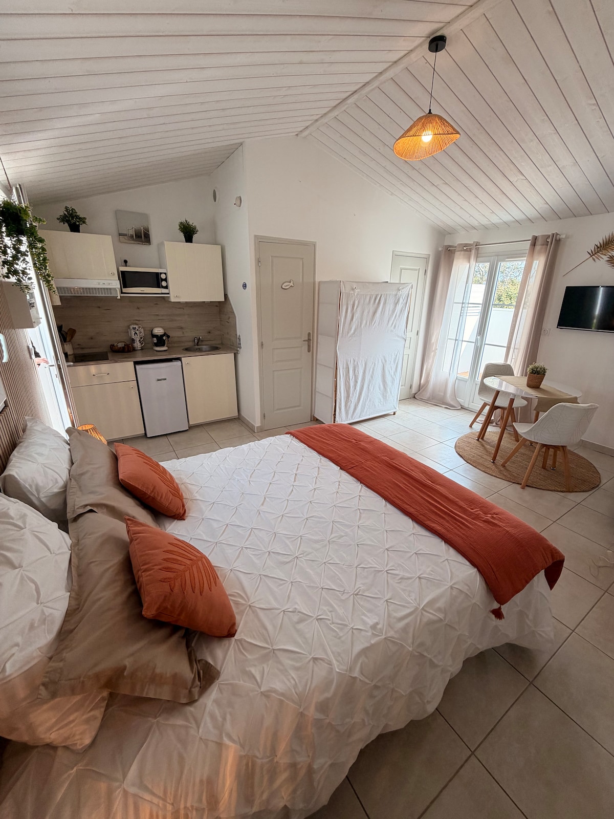 Ground floor apartment na 35m2 na binubuo ng silid - tulugan, kusina/sala at banyong may toilet. Matatagpuan ang accommodation na ito 20 metro mula sa dagat sa isang tahimik na kalye sa gitna ng isang mapayapang nayon sa isla ng Noirmoutier. Nilagyan ang kusina ng 4 - fire hob, tradisyonal na oven, at microwave. Mayroon ding refrigerator, coffee maker, at lahat ng accessory para sa pagluluto. May shower tray na 80*100 cm na may kabinet ng palanggana ang banyo.