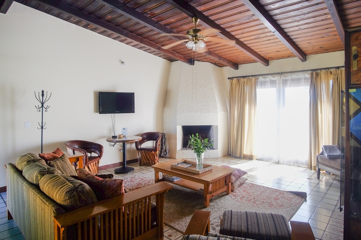 Maliwanag at kaakit - akit na komportableng bahay sa gitna. Nagtatampok ang tuluyan ng fire place, malaking bintana, southwestern na muwebles at dekorasyon sa iba 't ibang panig ng mundo. Kasama rito ang lahat ng amenidad para maging komportable ang iyong pamamalagi: Kumpletong kagamitan sa kusina, kalan, oven, microwave, dishwasher, refrigerator, dining area, pribadong banyo, office desk, TV, Cable, Wifi, ligtas, sakop na paradahan, washer at dryer, Queen size bed, Double size bed at couch sa sala, sakop na patyo at bakuran.