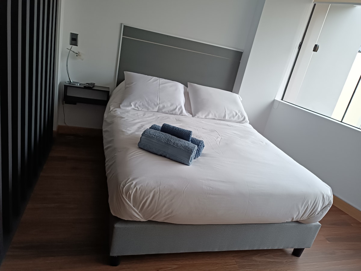 Ang eleganteng 1 silid - tulugan na apartment ay may higaan na 2 at kalahating higaan, pribadong banyo, smart TV sa silid - tulugan at isa pang TV sa kuwarto, na may pagbisita sa banyo, may washing machine, labahan, sa kusina ay may microwave, refrigerator, set ng mga kaldero, kumpleto sa kagamitan, ang Parqueo ay nasa labas ng mga pasilidad. May sofa bed para sa 2 tao ang sala. Isang bloke mula sa embahada ng Venezuela.Wally 🤩 gym at court.