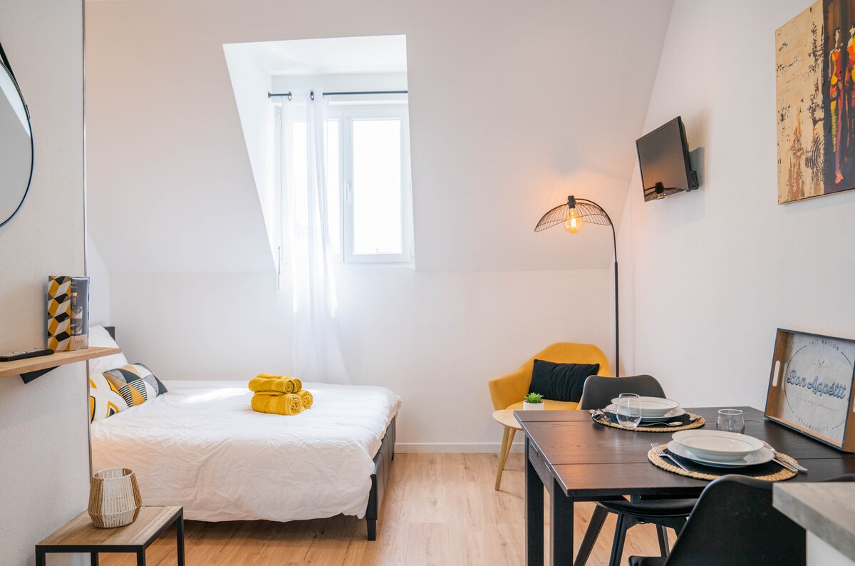 Mainit na studio ng 24 m² na inayos. Mayroon itong 140x190 na higaan at maliit na DAGDAG na sofa bed (1 bata o 1 tinedyer). Nilagyan ang studio ng baligtad na air conditioning para sa pinakamainam na kaginhawaan sa tag - init at taglamig. Solid parquet floor, metal canopy at tufa wall na kumpleto sa kagandahan. Lokasyon sa gitna ng isang shopping area 10 MINUTONG BIYAHE mula sa istasyon ng tren at Angers city center na may bus stop sa paanan ng gusali at libreng paradahan sa malapit.