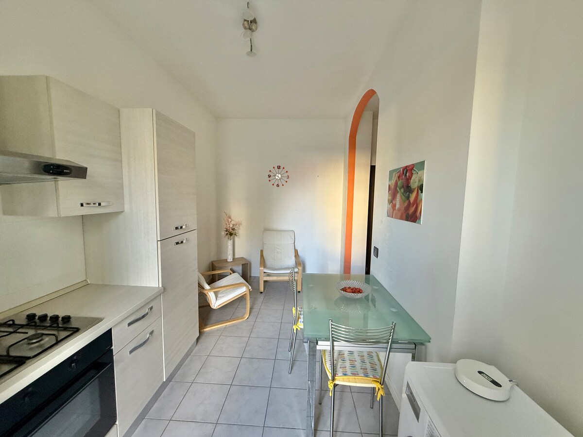 Alloggio a piano terra, da 1 a 4 persone, composto da cucina open space con l'entrata e dotata di lavastoviglie, forno, forno a microonde, macchina caffè capsule. Camera da letto matrimoniale. Sala che può essere usata come camera da letto perché dotata di letto matrimoniale a scomparsa. Bagno con doccia. Lavatrice con asse da stiro e ferro da stiro. Parcheggio libero, distanza 500 MT da Città Studi, 3km dall' ospedale, Parco della Burcina e centro Biella. Condominio tranquillo.