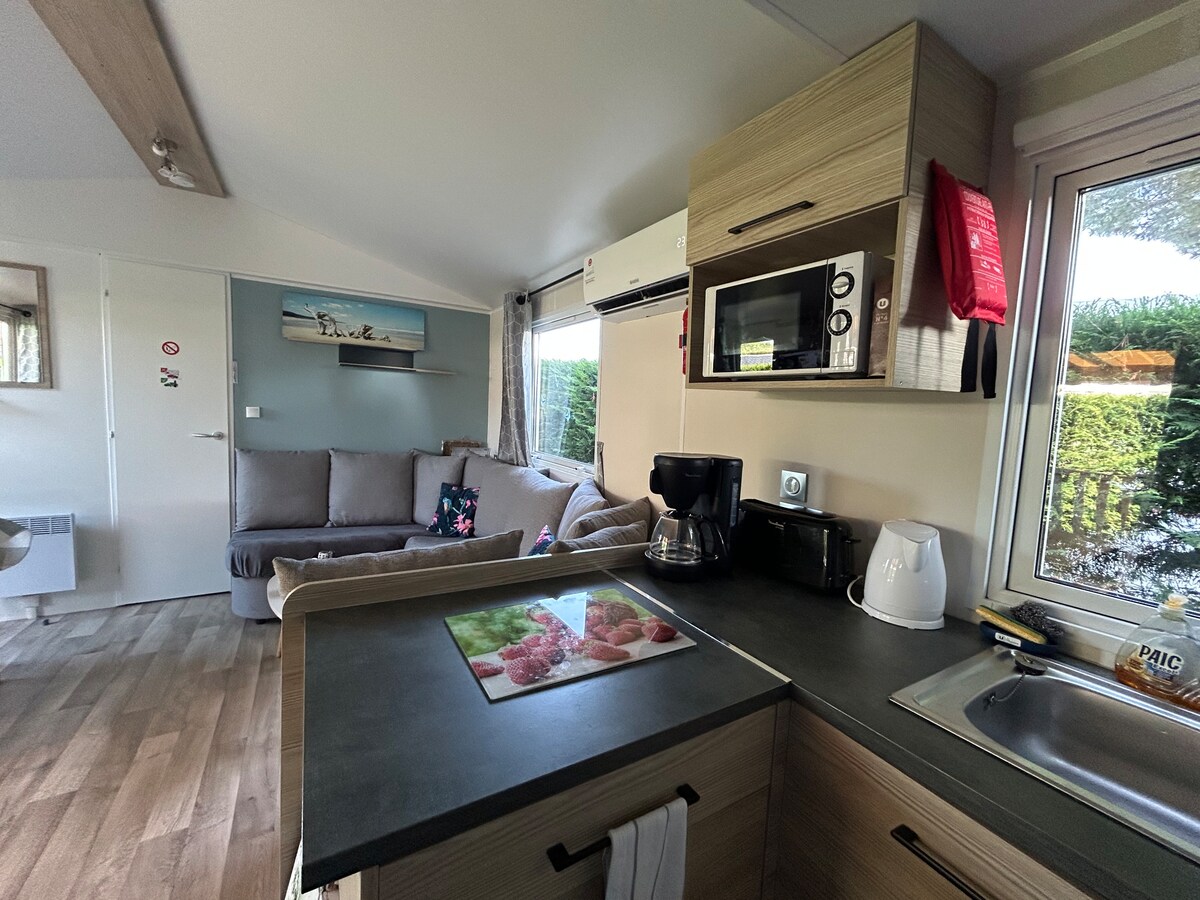 Premium mobile home (44m2) na naka - air condition para sa 4/6 na tao sa isang balangkas na hindi napapansin sa isang campsite ng 4* siblu Bonne Anse Plage Napakaluwag at maliwanag na sala na binubuo ng kusina /kainan at sala nito na may convertible na sulok na sofa 1 master bedroom bed 160cm na may mga kumpletong aparador na may toilet 1 silid - tulugan na may mga aparador na may 2 higaan ng 80 1 banyo na may 1 lababo, maluwang na shower, wc, towel dryer 15m2 covered terrace na may plancha, may bayad na wifi