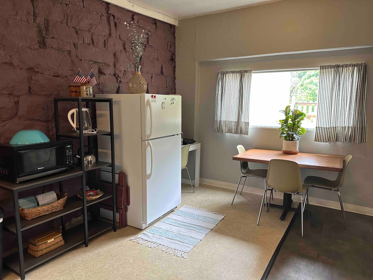 Magrelaks sa isang bahay na malayo sa aming kakaibang suite ng biyenan. (Ang Mil) Tumatanggap ang tuluyan ng 2 komportable. May kusina na nilagyan ng mainit na plato, microwave at oven para sa toaster kung saan puwede kang magprito, mag - ihaw, maghurno, atbp. May mini refrigerator na magagamit at lahat ng pangunahing kailangan para magluto ng pagkain. Isang bedroom area na may queen bed at full bathroom. Maaaring pangalawa ang sala bilang karagdagang tulugan. Nakaupo sa labas ng patyo, maganda ang tanawin mo sa mga bundok ng rurok ng Espanya.