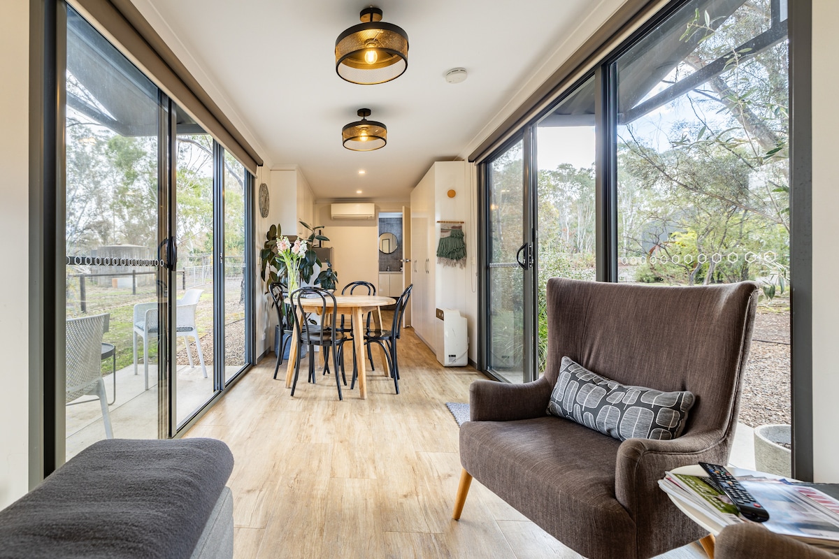Escape to this stylish, comfortable tiny house in Ravenswood, just 8 minutes from Harcourt, 20 minutes from Bendigo and 15 minutes from Castlemaine. Surrounded by peaceful bushland and rolling hills, and home to 14 adorable, friendly alpacas, it’s the perfect base for relaxation or exploration. With internet and air conditioning, it’s also ideal for remote work. Explore wineries, hike through scenic nature, unwind in comfort and a short drive from Bendigo’s vibrant attractions and cultural spots
