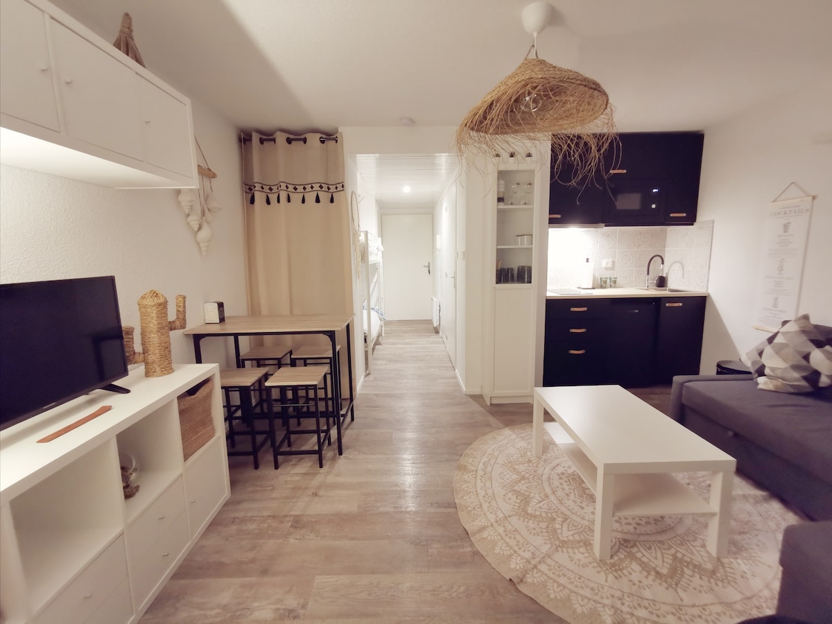 matatagpuan ang kaakit - akit na T2 na ito para sa 4 na tao at ang pribadong paradahan nito na 100 metro ang layo mula sa beach at malapit sa sentro. Nasa maigsing distansya ang lahat ng tindahan. Ganap na inayos, mayroon itong silid - tulugan, sala na may sofa bed at kusinang Amerikano, banyong may walk - in shower, hiwalay na toilet at balkonahe na nilagyan ng sala