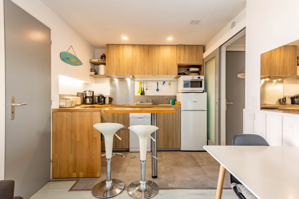 May perpektong kinalalagyan , ang apartment ay magbibigay - daan sa iyo upang tamasahin ang mga sentro ng lungsod at ang beach sa pamamagitan ng paglalakad ! Maaari mong iwanan ang iyong kotse sa ligtas na paradahan ng kotse ng gusali . Ang apartment ay may silid - tulugan, banyo/banyo, functional na sala na may sofa bed at bukas na kusina. Ang terrace ay magbibigay - daan sa iyo upang magkaroon ng iyong pagkain o aperitifs habang tinatangkilik ang paglubog ng araw sa ibabaw ng karagatan. Ang mga surfer ay magkakaroon ka ng access sa pinakamagagandang alon sa loob ng wala pang isang minuto!