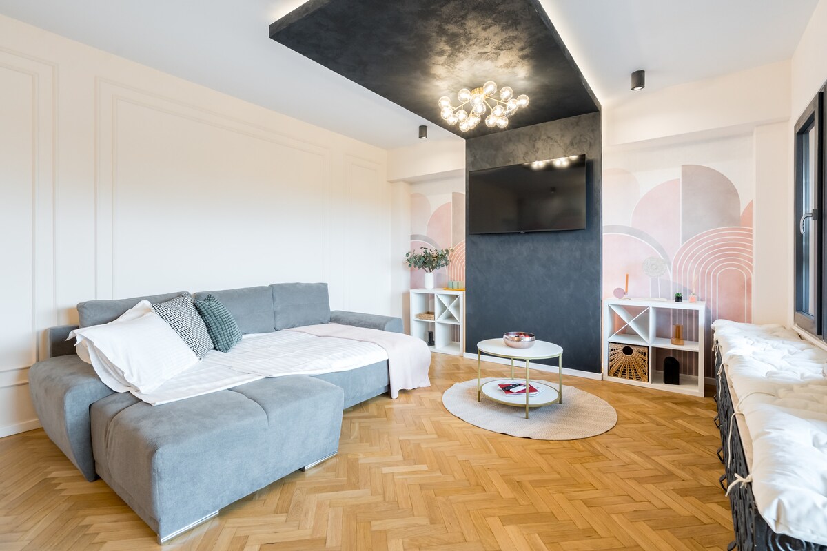 Enjoy a stylish experience in the center of Otopeni in the newest residential neighbourhood there is. All new buildings, private park, your private outdoor garden and many others. The listing is a state of the art studio, designer made with unique furniture pieces that stands out from all other listings. It's the perfect choice if you want to visit: Therme Spa, Olympic swimming pool, Airport, etc. also very close to bus station that goes directly in the heart of Bucharest into the "Old city"