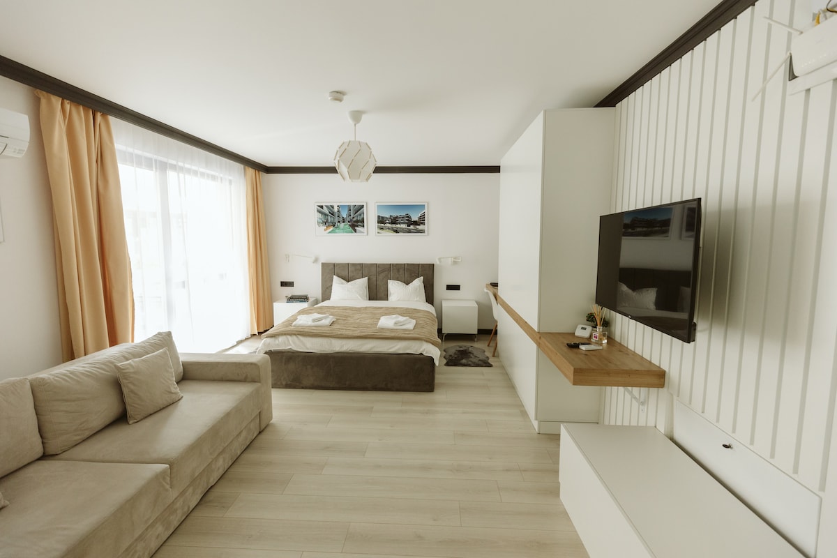 Matatagpuan ang apartment sa magandang lugar, ang Central Adress Residence (sa intersection ng kalye ng Nasaud at kalsada ng Progresului), 12 minuto ang layo mula sa Old Town o Unirii Square. Mayroon itong: - kuwartong may Queen size na higaan na 160x200 cm, katamtamang mattress para sa tahimik na pagtulog - Banyo na may Bathtub at Shower - kusinang kumpleto sa kagamitan Idinisenyo para mag - alok ng komportableng tuluyan para sa mga mag - asawa, indibidwal na biyahero, naghihintay sa iyo ang property na may high - speed na Internet, sa mainit na kapaligiran.