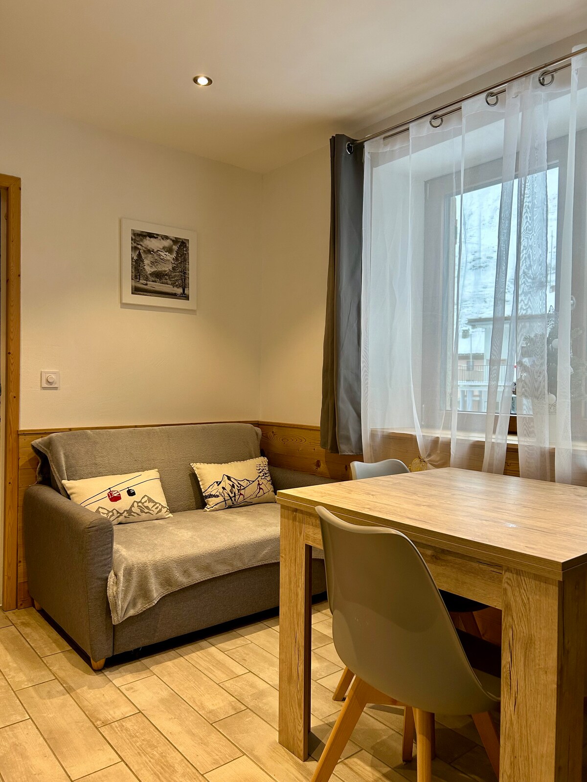 Pambihirang studio sa paanan ng mga dalisdis – Courchevel 1550 May perpektong lokasyon na nakaharap sa harap ng niyebe, nag - aalok ang inayos na studio na ito ng ski - in/ski - out access sa sikat na tirahan ng Lou Rei. Isang maikling lakad papunta sa mga tindahan, restawran at ski lift, mayroon itong ligtas na sakop na paradahan. Sa taglamig, dadalhin ka ng gondola ng Grangettes sa Courchevel 1850 sa loob ng wala pang 5 minuto (8am -11pm). Masiyahan sa pinong setting, na pinagsasama ang kaginhawaan, kagandahan at kaginhawaan, na may mga nakamamanghang tanawin ng mga bundok. ☀️🏔️❄️