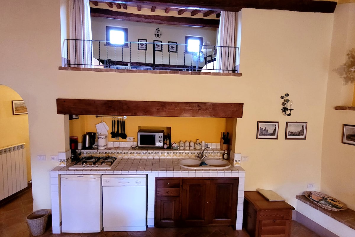STIAMO LźANDO PER VOI! ... GUMAGANA ANG % {bold PARA SA IYO! Ang bahay ay ganap na inayos at nilagyan noong 2018 ng klasikong - Tuscany na estilo ng kasangkapan. Ang mga kulay ay mainit at enveloping upang mas mahusay na makapagpahinga sa panahon ng iyong bakasyon ng kapayapaan at pagpapahinga. Bilang karagdagan sa dalawang double bedroom, mayroon kang kusina na may kitchenette, refrigerator, induction cooker at furnished terrace na may magandang tanawin ng nakapalibot na kanayunan.
