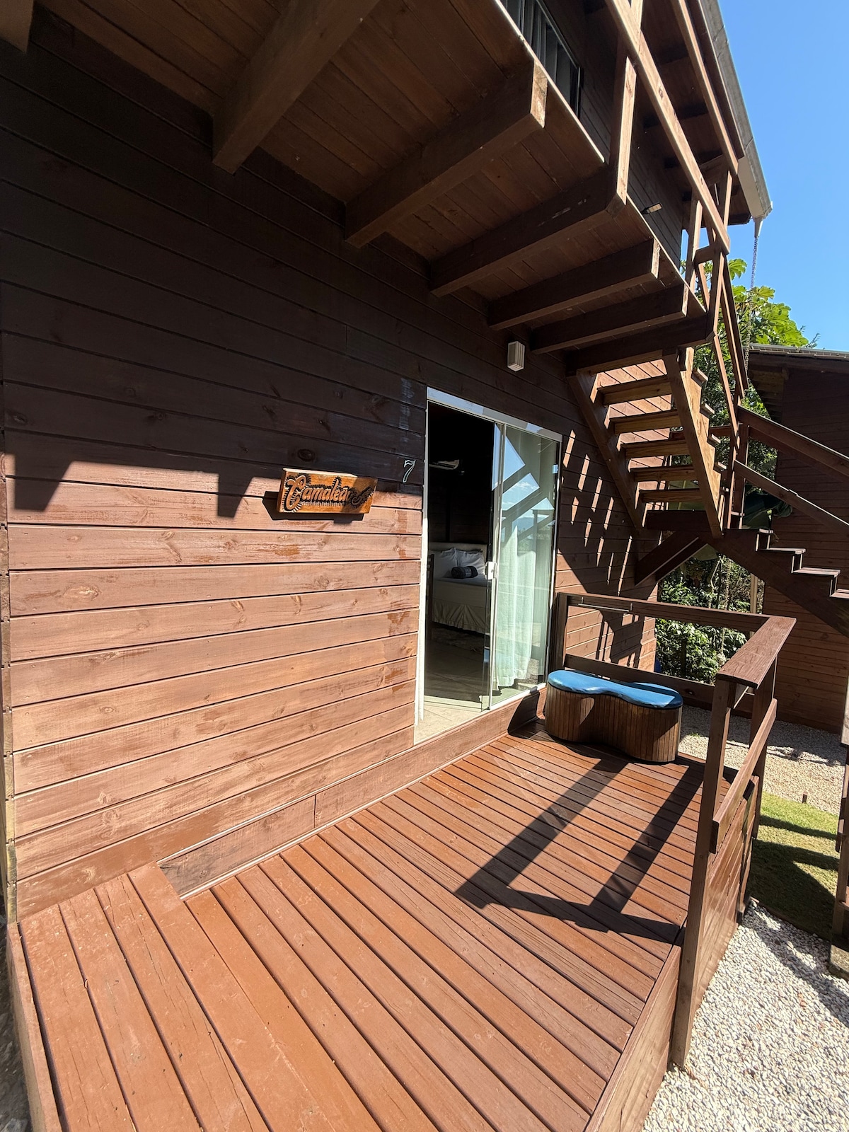 Ang cabin na may tanawin ng dagat, privacy, hot tub, mga armchair na kumakalma sa iyo, maaliwalas na dekorasyon, at mga ilaw na nagpapakita sa bawat kahoy na detalye ay lumilikha ng perpektong setting para makaranas ng mga di-malilimutang sandali. Matatagpuan ito sa pagitan ng mga kapitbahayan ng Santo Antônio de Lisboa at Sambaqui, sa isang kaakit-akit at tahimik na rehiyon na puno ng kalikasan at mga restawran, kung saan matatanaw ang pinakasikat na paglubog ng araw sa isla. Kusinang may kasangkapan, paradahan, Wi‑Fi, lugar para sa barbecue, at pribadong deck.
