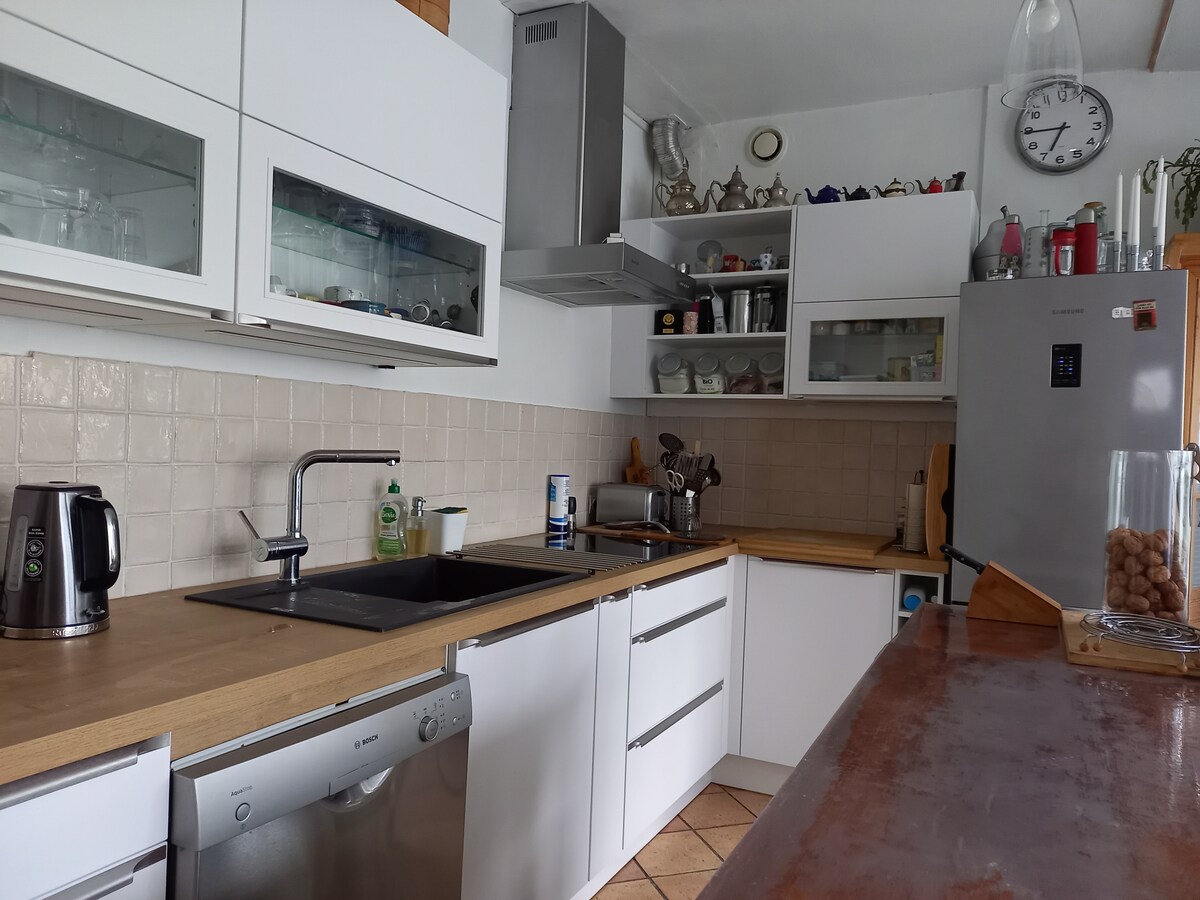 10 minutong lakad papunta sa sentro ng lungsod, karaniwang stall na may hardin, libreng paradahan sa kalye. May 4 na kuwarto at malaking sala kaya komportableng makakapamalagi ang 8 tao. May privacy at magkakasama‑sama rin. Isa sa mga kuwarto, na may shower room at toilet, ay nasa outbuilding na nasa hardin. Obligasyon ang paggalang sa kapitbahayan. 3-star na rating ng tourist office