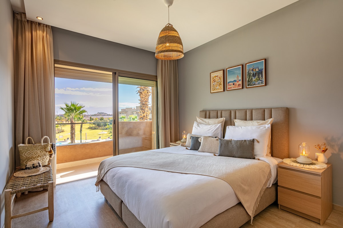 Matatagpuan sa gitna ng prestihiyosong tourist estate ng Marrakech Golf City, tuklasin ang marangyang apartment na ito na may mga pambihirang tanawin ng golf, pool, at marilag na bundok ng Atlas. Mapagmahal na pinalamutian ang apartment ng moderno, bohemian at beldi - chic na estilo. Kumpleto ang kagamitan nito at nag - aalok ito ng mga upscale na amenidad Nakatuon ang tirahan sa mga bundok ng atlas, napakapopular nito dahil sa tahimik at ligtas na setting nito at malapit ito sa sentro ng lungsod