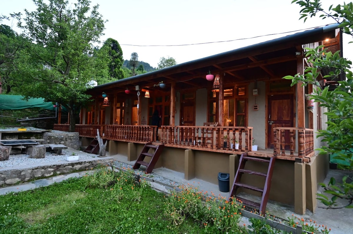 Magugustuhan mo ang naka - istilong dekorasyon ng kaakit - akit na lugar na matutuluyan na ito. Napapalibutan ng magagandang burol na may mga kuwartong gawa sa kahoy, na nag - aalok ng kumpletong katahimikan at mga nakamamanghang tanawin. Mayroon kaming maluluwag at lubos na komportableng mga kuwarto sa kategorya ng Deluxe, Super deluxe at Premium. May pribadong balkonahe at tanawin ng lambak ang lahat ng kuwarto. * Libreng gated na paradahan * Multi Cuisine restaurant * High Speed Internet * Apple Orchard Garden * Bornfire Area * Pribadong balkonahe na may bawat kuwarto