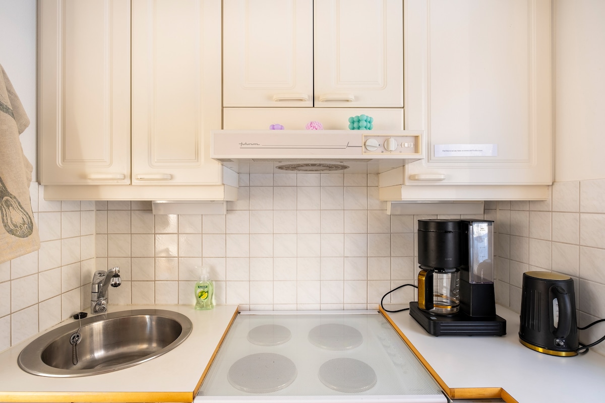 Kaakit - akit na mini house na may pribadong hardin at sariling sauna. Pinainit ang taon sa paligid, kaya mainit at maaliwalas din sa taglamig. Ginagawa ng A/C na komportable ang iyong pamamalagi sa panahon ng tag - init. Maliit na kusina na may kasamang lahat ng amenidad. Shower, toilet at sauna. Wifi at TV. Mga tulugan para sa limang (o anim) tao: - Double bed sa ibaba ng sahig (160cm ang lapad) - Double bed sa loft (180cm ang lapad) - Dalawang kutson (80x200cm at 65x190cm) at loft