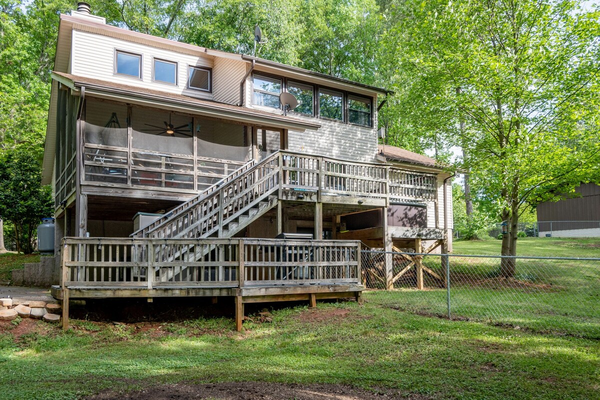LAKEFRONT, kahanga - hangang sunset, kamangha - manghang kapitbahayan na may maraming kagandahan! 3Br/2BA bahay sa liblib acre plus wooded lot. Mamahinga sa malaking screen sa beranda na may kamangha - manghang tanawin ng lawa o sa hot tub na itinayo sa deck. 2 silid - tulugan sa pangunahing (king & queen) na may paliguan at labahan sa bulwagan. Ang silid - tulugan sa itaas na loft ay may 2 buong kama at banyo kung saan matatanaw ang lawa. Pet friendly w/fee na nababakuran sa likod - bahay na may doggie ramp! Maganda ang lokasyon ilang minuto lang papunta sa I -26 at I -85. Madaling mapupuntahan ang Spartanburg, Greenville, at Greer!