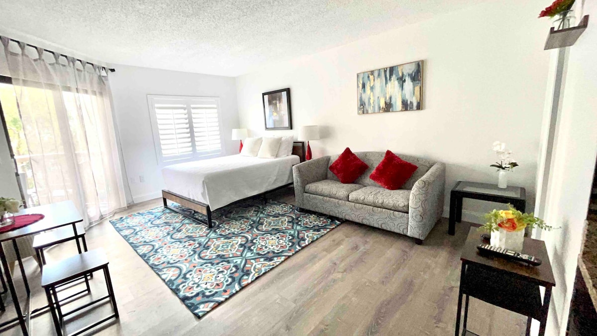 Magandang Studio na may malaking PRIBADONG TERRACE/King side bed. Enjoy the jacuzzi bathtub!!! Matatagpuan ang aming Studio isang bloke mula sa International Dr. Orlando City. Sa gitna ng lahat!!! Universal Studios Area. Paghuhugas ng video/YouTube https:// youtube.com/shorts/5XslwElr158?feature=share Ang resort ay may 2 bukas na swimming pool at 1 swimming pool na may saradong bubong, na may tempered water. HINDI INIREREKOMENDA ang property NA ito PARA SA MGA BATA, SANGGOL, o alagang hayop.