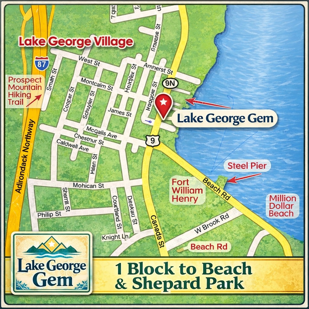 Lake George 2 bed, game room, pribadong loft para sa pagtulog