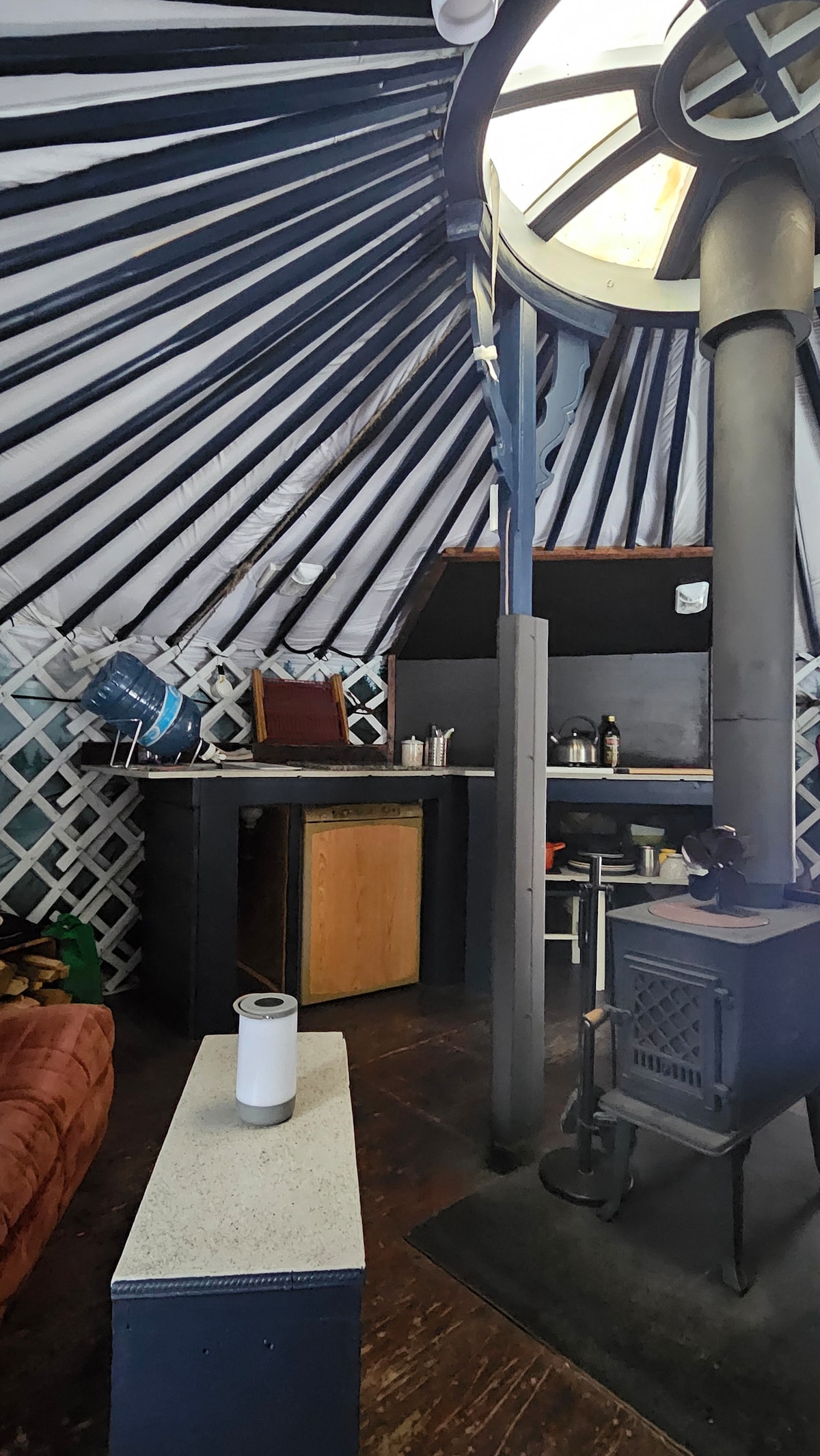 Magpahinga, magrelaks, at makaranas ng pambihirang pamamalagi sa buong gawang kamay na Mongolian yurt na ito na pinagsasama ang tradisyonal na pagkakayari at pambihirang modernong kaginhawaan. Huwag mong alalahanin ang lamig—ito ay tunay na kanlungan sa taglamig. May gamit na malakas na wood stove, de-kuryenteng fireplace, at mga karagdagang heater kaya mainit‑init ka sa panahon kahit na -20°C. Nagbibigay ng kalmadong espasyo ang mga bilugang dingding at banayad na ilaw para makapagpahinga, makahinga, at makapagpahinga ang isip. Nililinis at pinapanatili sa buong taon ang driveway para madaling makapunta roon.