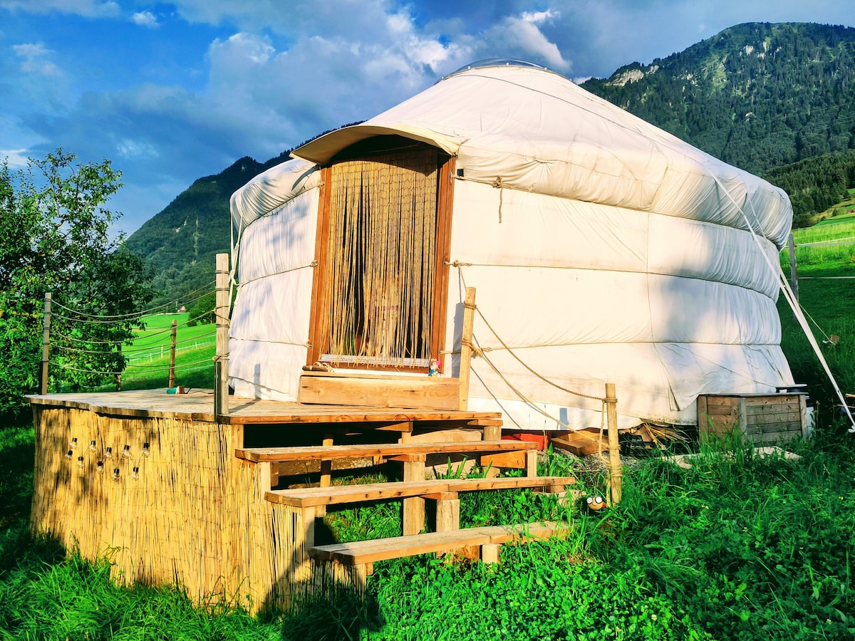 Ein Paradies für Familien, Clamping auf dem Bauernhof. Umgeben von Obstbäumen, Pferden, Kühen, Ziegen und Alpakas liegt die Jurte wunderschön eingebettet zwischen See und Bergen. Ideal für Ausflüge aller Art zu jeder Jahreszeit. In der Küche gibt es einen Gasherd mit 2 Platten. Dusche und WC sind 100 Meter von der Jurte entfernt. Strom kommt von der Sonne, geheizt wird mit Holz und fliessend Wasser hat es 50m. entfernt. Zmorge und Znacht kann(je nach Kapazität) auf Anfrage bestellt werden.