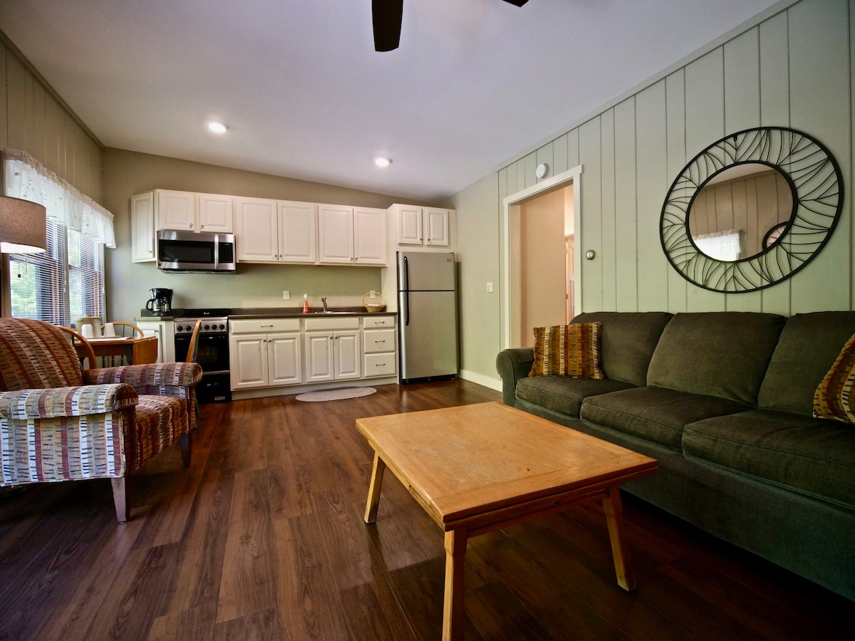 Private efficiency size cottage suite on the quaint grounds of Whaleback Inn, a historic hotel one mile south of Leland, Michigan. Highlights include a private queen bedroom, small living area with television and sofa sleeper, efficiency size kitchen, small balcony overlooking our woods. Whaleback Inn sits on a bluff overlooking North Lake Leelanau and boasts private docks across scenic M-22 Highway for your swimming enjoyment or coffee on the dock with sunrise!