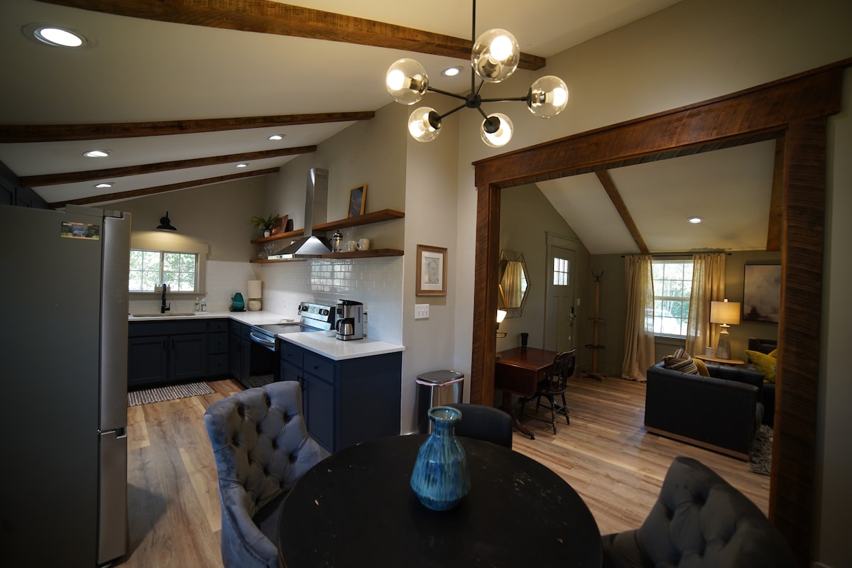 Minsan isang Man Cave, ngayon ang iyong matahimik na pagtakas! Nagtatampok ang maaliwalas na kanlungan na ito ng malawak na isla, sapat na seating, at 75" flat - screen smart TV na may surround sound - perpekto para sa mga nakakaaliw na bisita na may mga laro o gabi ng pelikula. Gamit ang open - concept na layout at salimbay na may vault na kisame, ang sala ay nagpapakita ng maluwang na ambiance ng cabin. Matatagpuan sa isang mapayapang komunidad sa kanayunan, ang pambihirang bakasyunan na ito ay naliligo sa masaganang natural na liwanag sa pamamagitan ng malalawak na bintana sa harap nito, na nakakaangat sa pangkalahatang tahimik na kapaligiran.