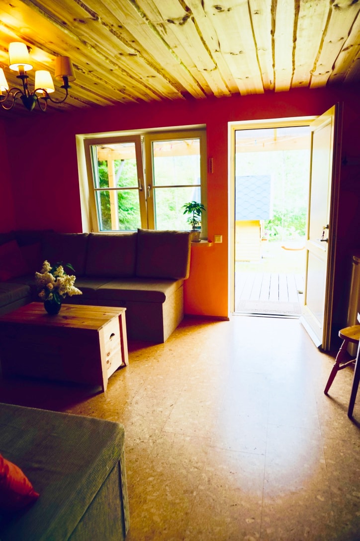 2 kuwento, bukas na plano, maliit na cabin. Tuktok - natutulog 4. (2 kutson) All - fold - out na couch - 2 in. Refrigerator, 2 - seater induction cooktop, cooking oven, dishwasher, fireplace - woodburner, air source heat pump. Mainit din ang bahay sa taglamig. Shower+ underfloor heating sa banyo. Patyo. Barrel sauna - € 70 dagdag. Grill - magdala ng uling, iba pang ibinigay. Palaruan para sa mga bata, trampoline, swing, zip line, playhouse, bakuran para sa pagtakbo. Mayroon kaming maliit na aso, maliit na kuneho, mga manok. Nakatira ang mga kapamilya sa bahay sa tabi.