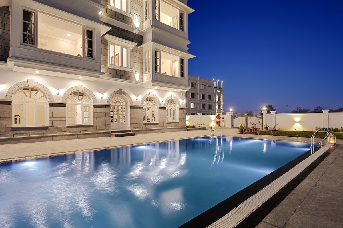 ★ Almusal, 1 Luxury Balcony Room ( 1st Floor) ★ Pribadong Premium na Banyo ★ MiniBar Pamana ng★ Arkitektura at Mga Modernong amenidad ★ Pinaghahatiang Pool Nagho - host ➤ kami ng mga dayuhang bisita at Indian sa buong taon. ➤ Mapayapang Lokasyon: ★ 15 minuto papunta sa Udaipur City Palace ( 5.5 Km), Mga Lawa at pamilihan! Serbisyo ng★ Taxi ★ Iniangkop na Itineraryo para sa pagtuklas ng mga tagong yaman/kultura Opsyon sa ★ Lokal na Lutuin ➤ Pinalamutian ng mga Kuwartong may magandang disenyo kung saan matatanaw ang Indoor Pool, ang Majestic Monsoon Palace/ Aravalli Hills!
