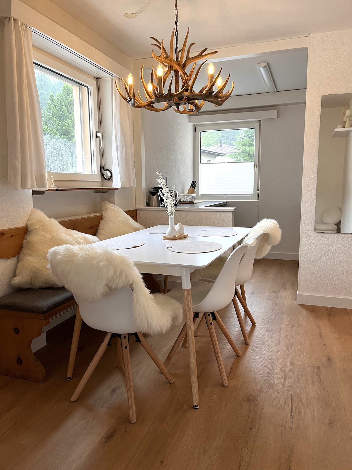 Eine gemütliche und stilvolle Wohnung mit schöner Aussicht auf die herrliche Berglandschaft wartet auf dich. Die Wohnung hat ganztags Sonne und verfügt über einen Gartensitzplatz. Die Küche ist voll ausgestattet, das Badezimmer verfügt über eine Badewanne und das Wohnzimmer lädt zum verweilen ein. Am Dorfrand gelegen und unweit von einer Bushaltestelle dient die Wohnung als ein idealer Ausgangspunkt für viele Ausflugsziele. Die Langlaufloipe ist in 3min zu Fuss erreichbar.