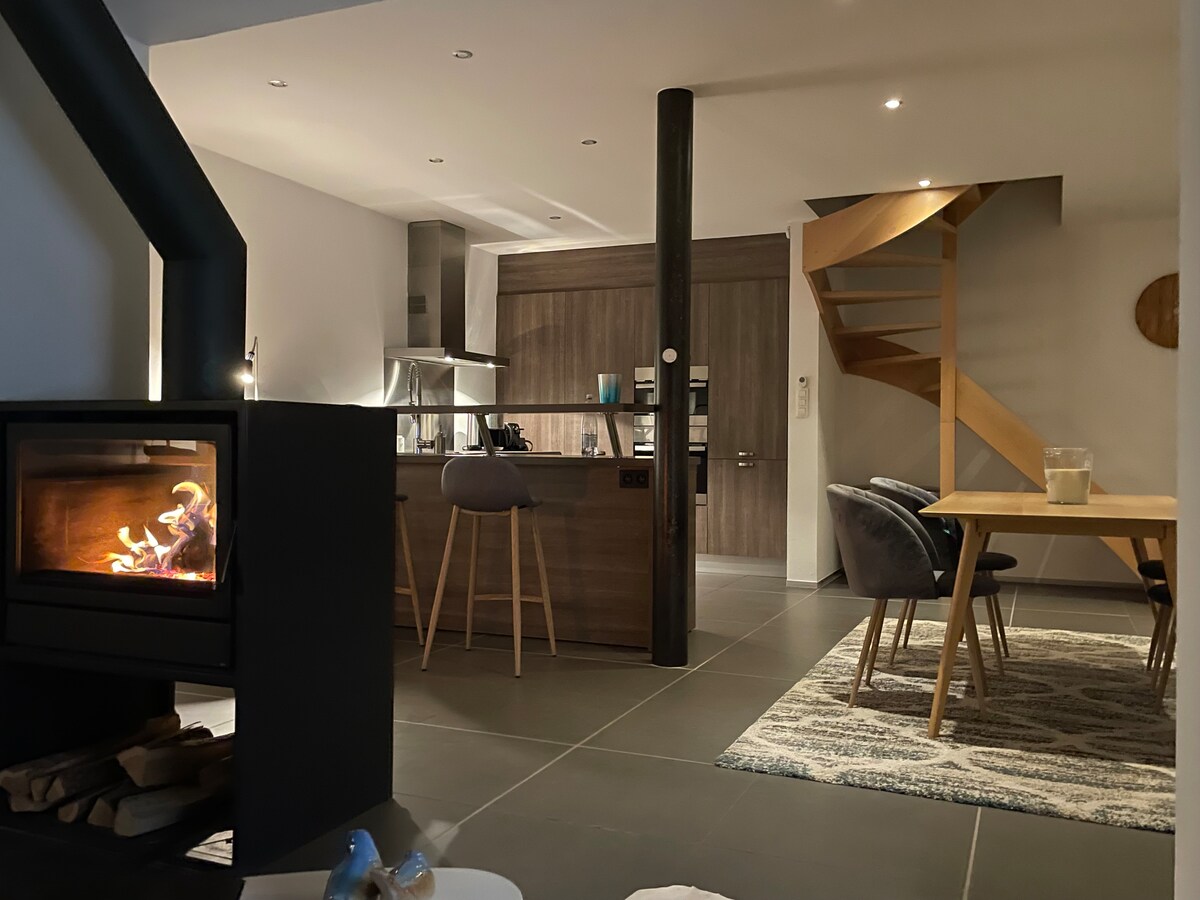 Matatagpuan sa tabi ng ilog, ang napakahusay na accommodation na 175 m2 na matatagpuan sa isang character property na may parke! Pribadong outdoor area ( access nang direkta mula sa apartment) maganda na may Jacuzzi prof, bbq, lounge at outdoor table. Indoor sauna Mainam para sa mag - asawang naghahanap ng privacy para makapagpahinga at matuklasan ang mga kayamanan ng rehiyon. Para sa reserbasyon ng 2 tao, isang kuwarto lang ang maa - access (maliban na lang kung may karagdagang singil na € 30/gabi). Matatagpuan 2 minuto mula sa isang istasyon ng tren ng SNCB.