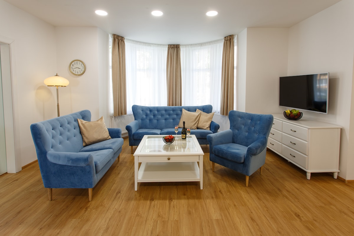 Magrenta ng modernong 3 + 1 apartment sa magandang lokasyon🏡 Paradahan 2 minuto mula sa tuluyan🅿️ Silid - tulugan, sala, kusina, silid - kainan, banyo, loggia. 🛋️ Sala na may smart TV (Netflix, OnePlay, Spotify) ⚡️ Mabilis na Wi - Fi sa buong apartment 🍳 Kumpletong kusina (kalan, refrigerator, microwave, pinggan) 🪞 Banyo na may mga tuwalya, shower gel, shampoo, labaha, toothbrush at interdental aid Available din ang mga 🧴 cream at pabango 💼 Work zone - de - kuryenteng adjustable na mesa, perpekto para sa tanggapan sa bahay